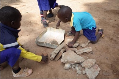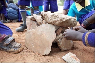 特筆すべきは、この施設の園庭の一角に、砂や石、ブロックといった瓦礫が積まれたスペースが設けられていた点です。子どもたちはそこから素材を運び出し、砂と瓦礫を用いてイメージをかたちにしていく構成遊びに夢中になっていました。半分に切られたポリタンクに石を入れて運び、それを家や建物に見立てて積み上げる中で、友だちとの対話や協同が見られました。石をどう積めば倒れないか、どんなかたちになるかを試行錯誤する様子は、子どもたちの創造性や探究心を強く感じさせるものでした。なかには、かまどを模してパンを焼くようなごっこ遊びに発展する例もありました。ブレイクタイムは短時間ですが、作られた作品はその後も園庭に残されており、子どもたちの表現が一過性のものでないことを示していました。