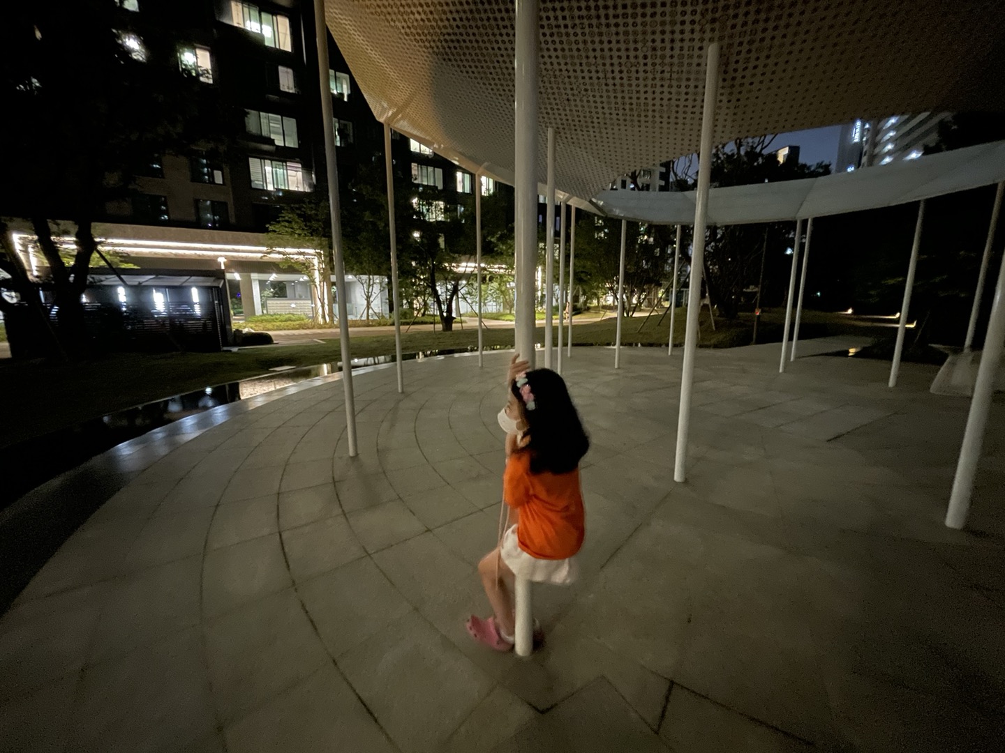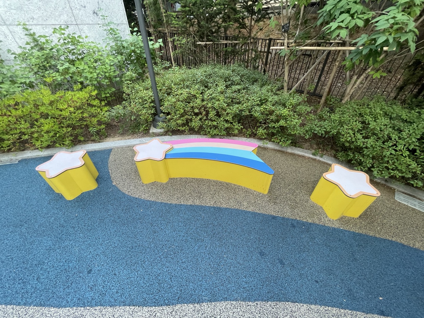 団地内の子どもの遊び環境は、かつてのように遊ぶための場所だけではなくなりました。年齢別の遊び場、図書館、キッズラウンジ、ママステーション&ラウンジ(学園バス乗り場)、ティールーム、映画ボックス、キャンプ場、プール、水遊び場、託児所(放課後保育)、共同保育共有センター(子育て)など多様な機能の空間が提供されている(表1)(図3)。さらに、屋外用の家具(ベンチ、花壇、手すり、オブジェ、照明など)もある。 創造的な自由遊びを支援し、身近な自然を作ることにより、子どもたちが遊びに活用したり、探索したりできるようになっている(図6)。とりわけ、屋外シェルターを団地内に多数設けることで、屋外遊びの連続性を高めるような計画がなされている(図7)。
